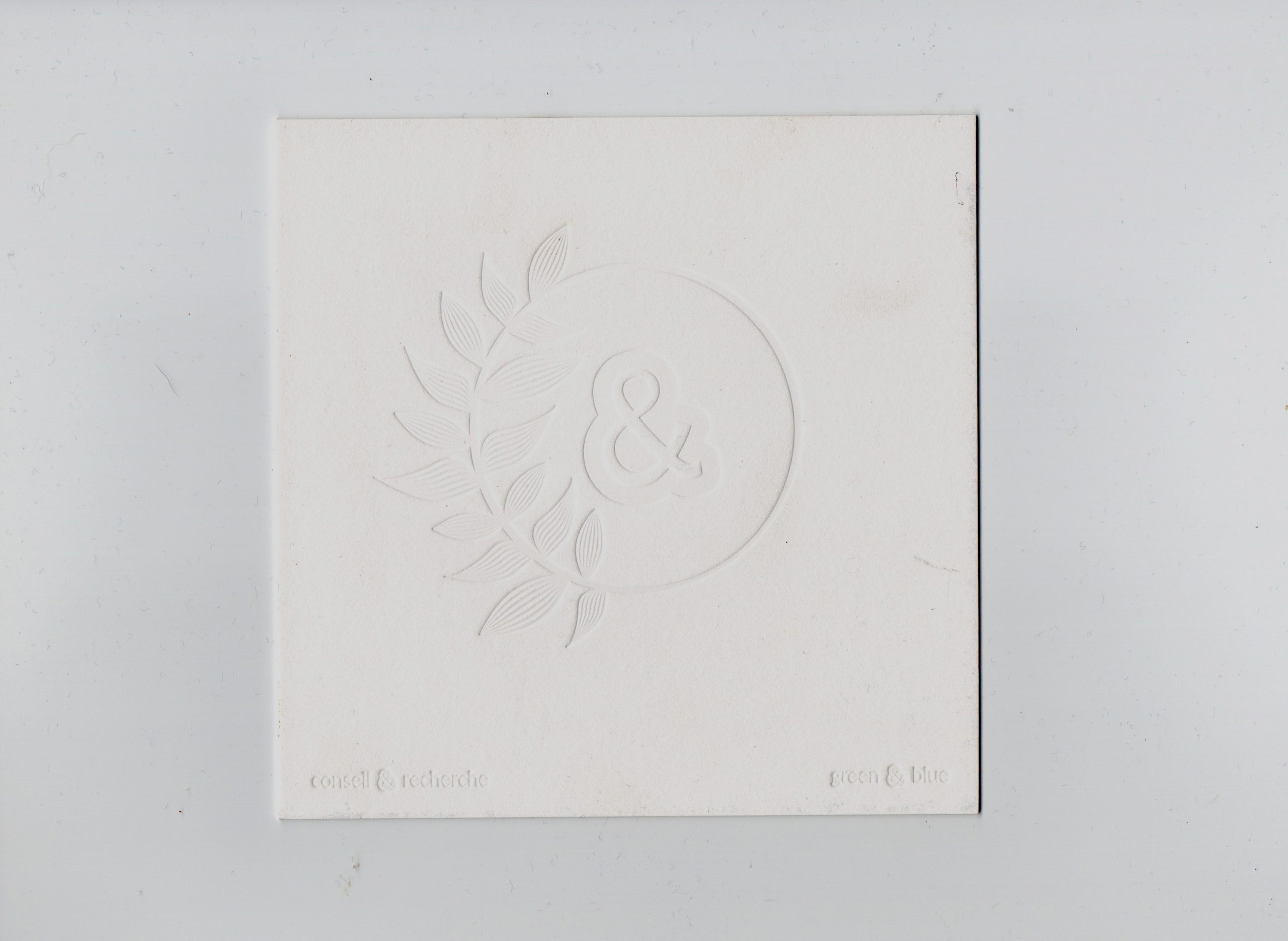 Réalisée sur un papier recyclé et certifié, elle se distingue par un embossage à froid mettant en relief le logo et le motif végétal, sans recours à l’encre ni au vernis.